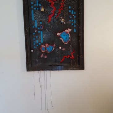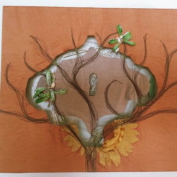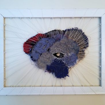 Embroidery and spray paint on canvas24″ X 24″ X 2″